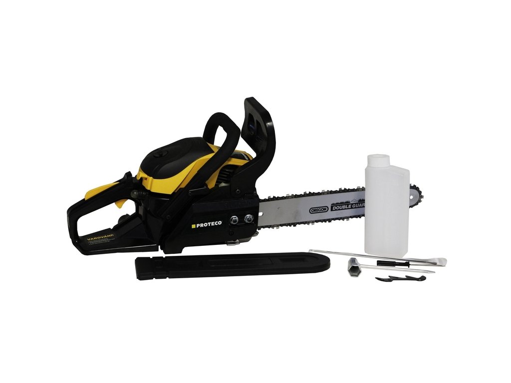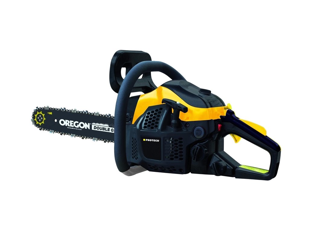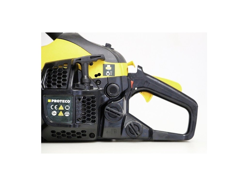 Řetězová pila benzínová Proteco je ideální pomocník pro řezání dřeva malých a středních průměrů, odvětvování, prořezávání, řezání palivového dříví apod. Zdařilá kombinace vysokootáčkového dvoutaktního motoru o zdvihovém objemu 37.2 cm³ a výkonu 1,2 kW činí z motorové pily velmi oblíbeného komfortního a kompaktního pomocníka pro každého vášnivého kutila, či zahrádkáře. Motorová pila disponuje 35 cm lištou a řetězem Oregon pro plnění i těch náročnějších úkolů. Motor je sestavou silentbloků a plastových krytů nejen chráněn proti nárazu, ale i spolu s odstředivou spojkou maximální možnou měrou zbaven vibrací a hlučnosti. Optimální napnutí pilového řetězu lze snadno seřídit pomocí šroubu na boční straně motorové pily.