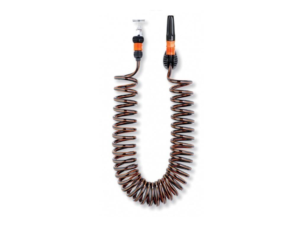 Spirálová zavlažovací hadice Claber Spiral Kit De Luxe - 10 m + příslušenství. 3/4" napojovací konektor. Pistolový postřikovač, věšák na zeď. Ideální pro použití na balkonech, terasách a malých zahradách. Použití kvalitních materiálů.Doplňkové parametry